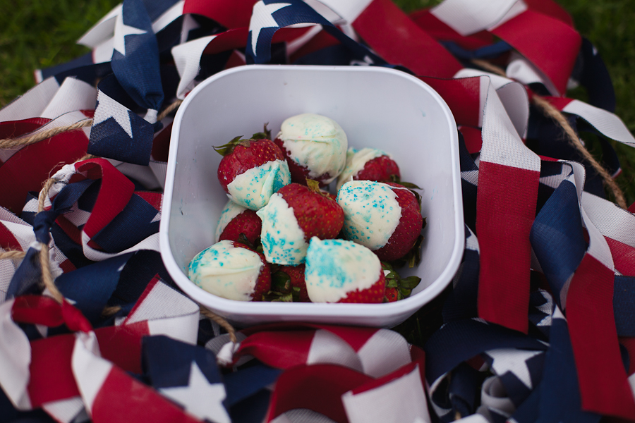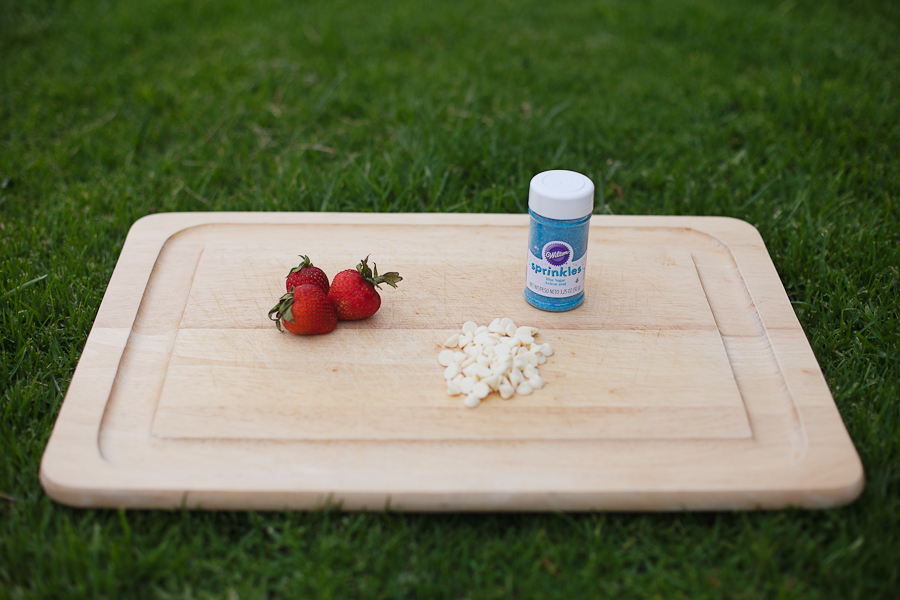 Prepare a baking pan and cover it in wax paper. Melt white chocolate chips on low heat. Roll bottom half of strawberry in white chocolate then immediately add sprinkles before the chocolate hardens.