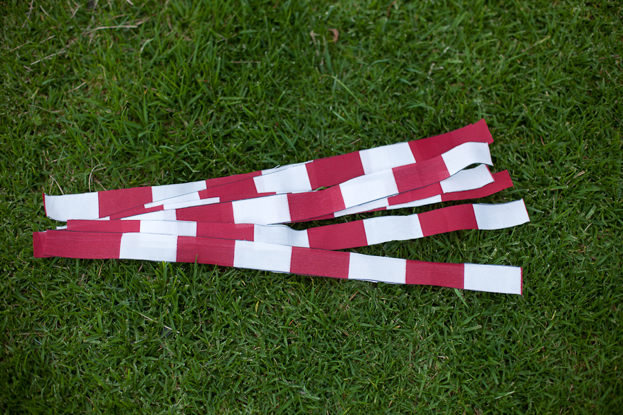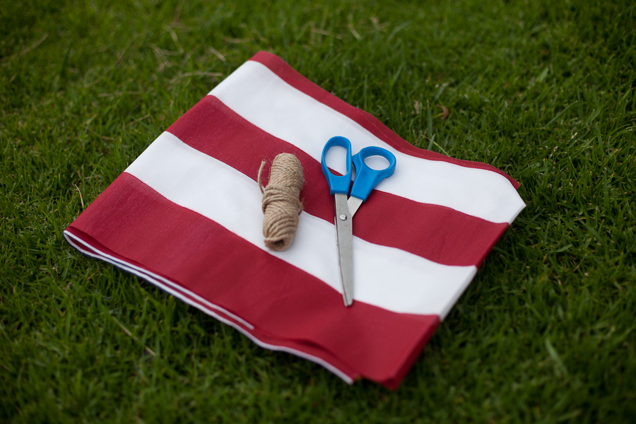 Cut material into 1" strips. I used a 4' long string of twine and knotted the strips of material 1-2" apart from each other.